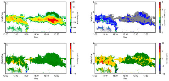 - In addition to radar base data, this study employs a small-particle-tracing method [21,22] to calculate the average terminal fall velocity (Vt) of the particles and subsequently retrieve the vertical air velocity (Vair). The basic principle is that for the smallest particles that can be measured by a highly sensitive millimeter wave radar, their own velocity is essentially negligible compared to the convective wind speed, so their signal can be used as a tracer to reverse the atmospheric vertical velocity [20,23].