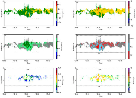 Figure 7a–h show radar observations and retrieval results for a case of cumulus (Case 2) on 30 May 2023, from 17:00 to 18:00. As seen in Figure 7a, the cloud top height ranges between 4 and 5 km, with a cloud thickness of approximately 3 km. The overall radar reflectivity (Ze) is relatively low, with most areas exhibiting Ze values below 0 dBZ. The high reflectivity region is concentrated within the cloud (between 3 and 4 km). The retrieval results of σv indicate that, during the period from 17:10 to 17:35, the internal parts of the cumulus cloud, especially the upper and middle parts, exhibit σv values exceeding 0.4 m/s, suggesting the possible coexistence of particles with multiple phases within the cloud. From the retrievals of VD, Vair, and Vt in Figure 7c–e, it is observed that during the entire period, most of the cloud is filled with updrafts, with the updraft velocity reaching up to 5 m/s near the cloud top. The maximum Vt approaches −4 m/s, corresponding to the high σv region.