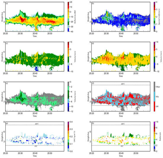 Figure 6a–h show the radar detection and retrieval results for a stratocumulus system case at 13:00 on 18 May 2023. From the overall Ze echo, the cloud top height is about 6 km, the cloud thickness is about 3 km, and there is a significant echo intensity gradient within the cloud, with the strongest reaching above 10 dBZ at around 4 km. Compared to the second cloud body, the first cloud body has a wider region of large σv values, with most areas inside the cloud having a σv greater than 0.4 m/s, indicating the possible coexistence of ice crystals and supercooled droplets of different sizes within the cloud, which leads to an overall increase in the σv due to their different fall speeds [14]. The mean Doppler velocity VD (Figure 6c), retrieved atmospheric vertical velocity Vair (Figure 6d), and particle mean terminal fall velocity (Figure 6e) show that the first cloud is mainly accompanied with updrafts, with the maximum exceeding 5 m/s, corresponding to the regions of high σv; meanwhile, the second cloud has relatively smaller updrafts, mainly concentrated in the central region, and weaker near the cloud top and cloud base weak echo areas, with most of the cloud experiencing downdrafts at around 1.0 m/s. Additionally, the is mostly below −1.0 m/s, with the maximum reaching −6.0 m/s, corresponding to the strong Ze regions and matching the high Vair and σv areas.