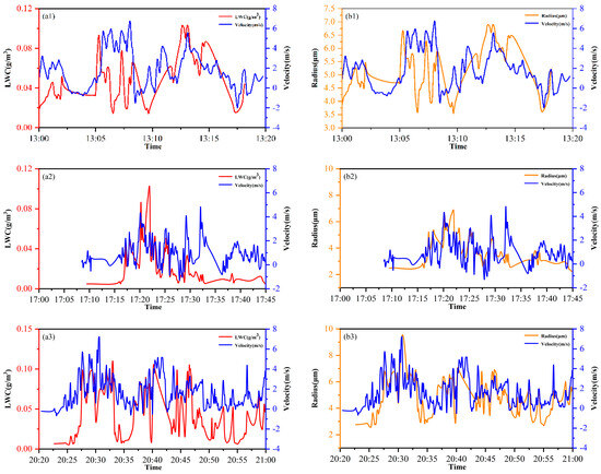 Trends in vertical air velocity (Vair) and liquid water content (LWC) (a1–a3) and the effective radius of supercooled water droplets (Re) (b1–b3) within the supercooled water regions for the two cases. Panels (a1,b1) depict the temporal variations of these three variables at 3.5 km for Case 1, panels (a2,b2) show the temporal variations of these three variables at 4.05 km for Case 2, while panels (a3,b3) show the temporal variations in these three variables at 4.5 km for Case 3.