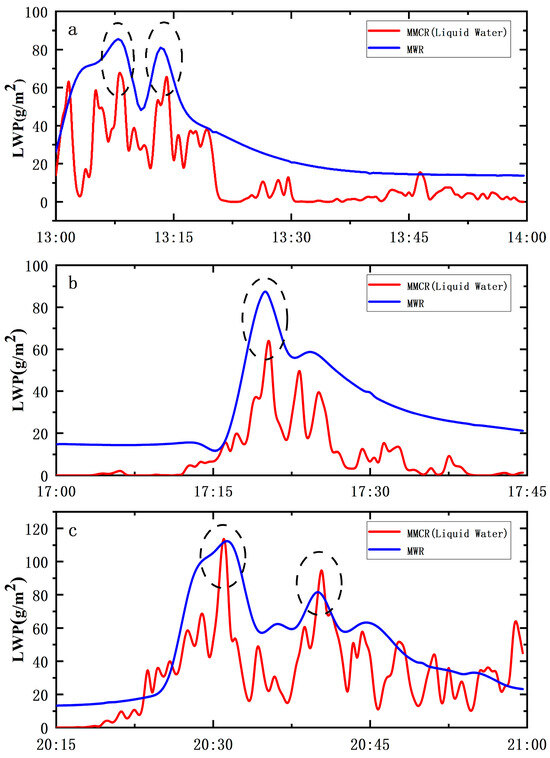 Comparison of liquid water path (LWP, g/m2) retrieved by radar (MMCR) and microwave radiometer (MWR). (a–c) represent the periods from 13:00 to 14:00 on 18 May, from 17:00 to 17:45 on 30 May, and from 20:15 to 21:00 on 30 May, respectively.