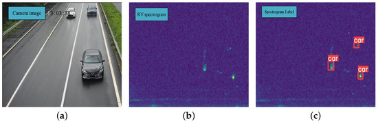 Additionally, each mmWave radar RV spectrogram is paired with a corresponding camera image to facilitate target labeling within the spectrogram. Figure 3a,b provide an illustrative frame of the captured camera image and RV spectrogram dataset. We adopt target sensing labeling methods commonly used in image vision, as shown in Figure 3c. Specifically, for the mmWave radar RV spectrogram, we employ 2D bounding boxes to label vehicle targets [39].