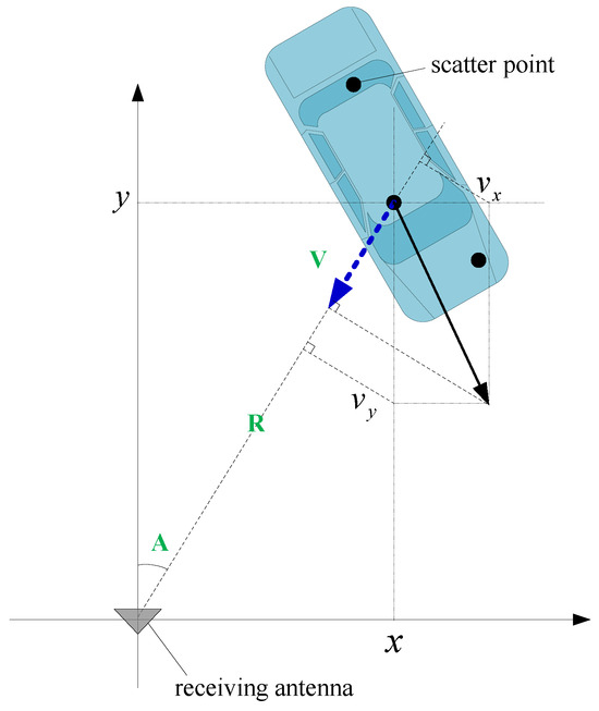 According to Equations (6) and (7), and can be obtained, where formula (5) reaches the peak value. Subsequently, the velocity and range information of the vehicle can be acquired. Following the processing of the mmWave radar echo signal by the first and second FFTs, the corresponding range velocity spectrograms are generated. In multi-antenna reception, the received signals of target number T with angle directions and on each element of the receiving array can be represented as a weighted form of T echoes [5]: