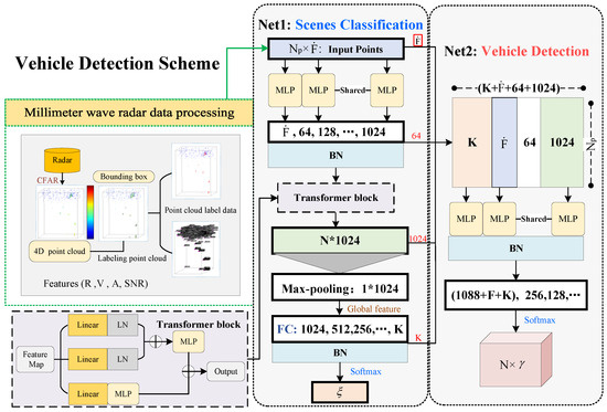 As depicted in Figure 7, the proposed scheme consists of three integral components: the transformer block, the scene classification block, and the vehicle detection block. The transformer block incorporates a self-attention layer, designed to streamline dimensionality reduction while expediting linear projection and residual connections. Input data comprise a set of six-channel vectors, each pair consisting of . The transformer block is crucial in fostering information exchange among local feature vectors within the point cloud data. This process generates new feature vectors for all points, significantly enriching the interconnections between each point.