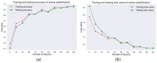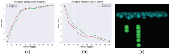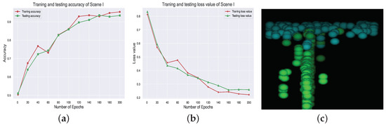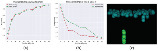 As depicted in Figure 11a,b, throughout the training and testing phases in Scene III, there is a consistent enhancement observed in the rise in detection accuracy and the reduction in loss function values; and detection accuracy ultimately reaches 98.05% and 97.85%. Compared with the preceding scenes, Scene III demonstrates notably improved detection accuracy and reduced fluctuations in loss function values during training and testing. This improvement can be attributed to the favorable conditions present in Scene III, which contribute to a more stable training process. Notably, the complexity of Scene III is lower than that of Scene I and Scene II, with no overlap between vehicle and clutter points, nor interference among vehicle points themselves, as shown in Figure 11c. Consequently, the detection accuracy of Scene III surpasses that of the previous scenes, while the loss function value is minimized.