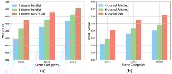 Results of various models in various scenes. (a) Testing accuracy results of three scenes. (b) The mIoU values of three scenes.