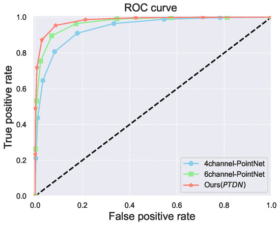 To assess the vehicle detection performance of the proposed scheme, this paper selects the four-channel and six-channel traditional PointNet algorithms as benchmarks, respectively. As illustrated in Figure 12a,b, the proposed scheme exhibits the highest vehicle detection accuracy and mIOU values across all three scenes. In addition, to illustrate the performance of the proposed algorithm, we conduct additional statistical analyses to complement our experimental results, which include receiver operating characteristic (ROC) curves. As shown in Figure 13, we choose the more complex Scene I for evaluation. The ROC curve of the proposed algorithm consistently stays above the other curves, indicating a higher true positive rate at various false positive rates. This means the proposed algorithm can better identify positive cases while maintaining a lower rate of false positives. The area under the ROC curve (AUC) for the proposed algorithm is presumably higher, which measures the model’s ability to distinguish between positive and negative cases. A higher AUC implies that the model has a better predictive performance.