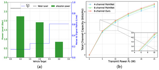 The communication experiments examine the communication performance achieved by the proposed vehicle detection scheme across a three-vehicle scene, the distances from the three vehicles to BS are 100 m, 132 m, and 204 m, respectively, as shown in Figure 3. The Equation (24) is used to calculate the proposed optimization problem (23) wherein power allocation is conducted for three vehicle targets under the constraint of the constant total transmission power W. The outcomes of the power allocation process are depicted in Figure 14a, the power levels of the three vehicles are 2.24 W, 1.91 W, and 0.85 W, respectively, and the water level value is 2.676 W. Specifically, we analyze the power level allocation and channel capacity achieved by the proposed scheme and compare them with the benchmarks. This evaluation provides insights into the overall effectiveness of the proposed scheme in enhancing detection accuracy and communication performance.