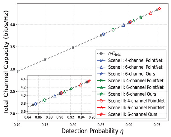 Furthermore, the experiments on the total channel capacity across varying vehicle detection probabilities are conducted, showcasing the overall channel capacity enhancements attributed to the proposed vehicle detection scheme and the benchmark across three distinct scenes. As depicted in Figure 15, the proposed vehicle detection scheme exhibits the most significant communication performance gains among the three scenes and achieves the highest total channel capacity.