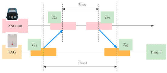 We assume is the time interval between tags that transmit a signal and receive a return. represents the delay of each module [24]. The distance formula for the relationship between anchors and tags can be expressed as follows: