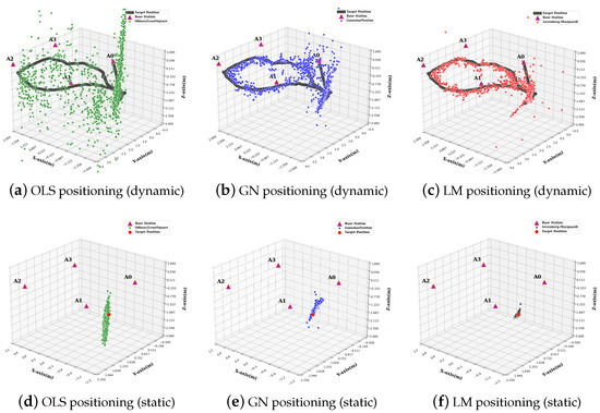 Equation (9) is a system of linear equations for the variable , solved by the Gaussian-Newton or regular equation. We define the coefficients as H (left side) and g (right side). Figure 3b,e shows the dynamic and static positioning results.