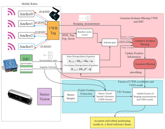 To address these limitations, this study proposes integrating UWB, IMU, and binocular visual odometry [29]. This fusion allows UWB to correct the cumulative errors of IMU/visual odometry, while the latter two smooth UWB data and mitigate multi-path effects [30], offering a more accurate and reliable positioning solution for indoor mobile vehicles.