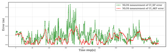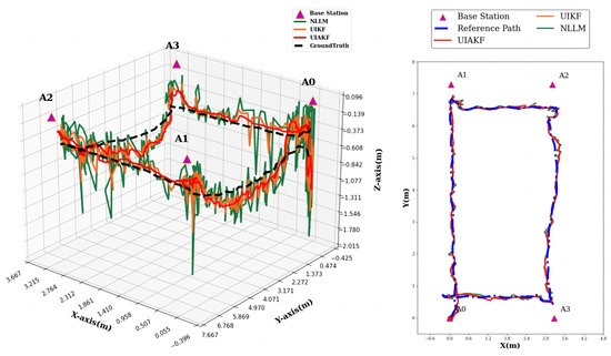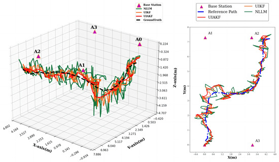 Figure 8 provides a comparison between the UIAKF, UIKF, NLLM, and reference paths. The red line represents the UIAKF path, the orange line represents UIKF, the green line represents NLLM, and the black line represents the reference path. The NLLM method struggles when faced with poor distance measurements in NLOS situations. If one of the anchors is blocked, the NLLM method can be negatively affected by such measurements, leading to issues like gradient explosions or outliers. As a result, the NLLM positioning errors fluctuate compared to the actual path.