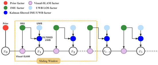 Both the UWB fusion system and VIO receive the IMU information at the same timestamps, enabling a flexible combination of sensor information with various measurement frequencies. Normally, visual sensors have the lowest frequency (20–30 Hz), which is used to determine the node frequency. This study employs the sliding window method, which sets the number of historical variables used for computation. The size is empirically tuned through experiments to ensure the output rate matches the refresh rate from the visual sensor.