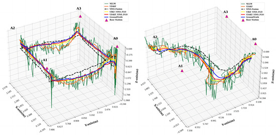 Figure 11 shows a comparison of the trajectories estimated using the different methods with the reference trajectory in 3D, and Figure 12 shows a comparison of the trajectories estimated using the different methods with the reference trajectory in 2D. Table 3 reports the positioning performance of each method.