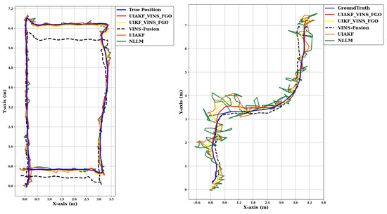 Furthermore, despite the dissimilarities in methodology and error characteristics between VINS-Fusion and UIAKF, with VINS primarily affected by accumulated errors and UIAKF influenced by fluctuating standard deviation errors concerning the ground truth, the UIAKF method exhibits similar initial performance to VINS-Fusion but outperforms it in the long run. Notably, VINS demonstrates good performance initially but gradually deteriorates due to the increasing deviation between its estimated position and the ground truth. VINS relies on camera SLAM estimation instead of absolute calculations based on observation data. In comparison to VINS-Fusion, UIAKF achieves reductions in RMSEs of 6.9% in the X direction, 68.2% in the Y direction, and 65.8% in the z direction.