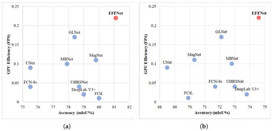 The GPU inference frames per second (FPS) and Mean Intersection over Union (mIoU) accuracy are evaluated on the (a) Vaihingen and (b) Potsdam datasets. EFFNet (represented by red dots) outperforms existing networks, including GLNet, in terms of both inference speed and accuracy for segmenting ultra-high-resolution images.