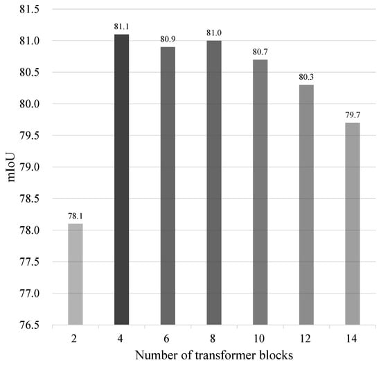 Figure 6 presents an ablation study on the impact of the number on transformer blocks. Building upon the default model with eight transformer blocks, an experiment was performed using various transformer blocks to explore their impact on the model’s performance. The findings show that the model performs best in training when using four transformer blocks with downsample ratios of 4×, achieving a mIoU of 81.1%. The experimental results show that four transformer blocks are effective in extracting multilevel features, such as image edges and textures. The model is also effective in capturing extensive contextual background information. However, when increasing the number of transformer blocks, overfitting issues can occur when using the training data, leading to a decrease in model performance on the test data, as reflected in the reduction in mIoU.