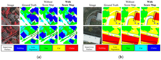 Comparison of semantic segmentation results with and without score map on (a) Vaihingen and (b) Potsdam datasets.