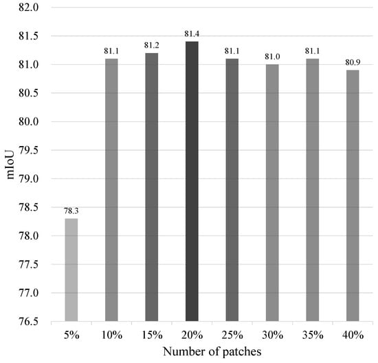 We used the top 5% to 40% weighted patches in the score map to extract local features separately, which were then fused with global features. Figure 8 shows that when increasing from the top 5% weighted patches to the top 20% weighted patches, the mIoU gradually rises from 78.3 to 81.4, reaching its maximum value of 81.4 at the top 20% weighted patches. As the top percentage continues to increase to 40%, the mIoU gradually decreases to 80.9.