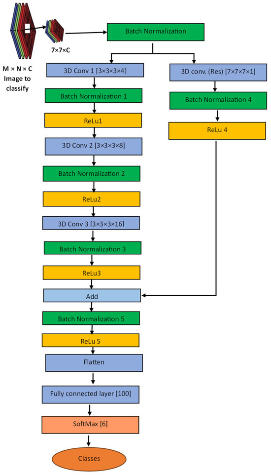 The proposed model is engineered to process a stacked image comprising ASTER image bands, BR images, and selected PC bands as its input. The architectural blueprint of the proposed model is founded on the framework introduced by [17], which refines the design put forth by [18]. The latter incorporates a few 3D convolutional layers, including a residual layer, to enhance the generalization capacity, mitigate overfitting, prevent gradient disappearance, and improve the learning rate. Notably, the proposed model adheres to a consistent use of a small receptive field (3 × 3 × 3) for all convolutional layers, as advocated by [55]; this is particularly effective for spatiotemporal feature extraction, especially in instances where the features possess limited spatial coverage. This uniformity in kernel size across layers is posited to yield more precise results compared with disparate kernel sizes for each layer [56]. The adoption of a small kernel size is necessitated by the modest size of the input patch required, set at 7 × 7 × C, where “C” denotes the number of bands (Figure 2). This configuration allows a 3 × 3 × 3 kernel to perform three convolutions (without maximum pooling, stride, or padding), thereby expediting operations. The choice of the 7 × 7 patch size aims to strike a balance between providing sufficient contextual information and maintaining classification precision, especially considering the 15 m × 15 m resolution of the resampled image and the nature of the deposits under investigation. Additionally, pixels within a small spatial vicinity generally reflect the same underlying material.