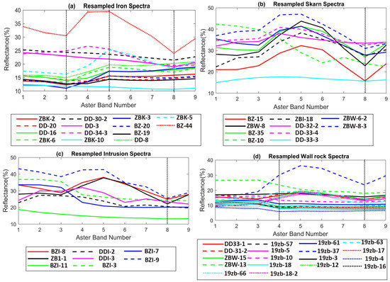 Resampled spectral profile of the collected samples. In the case of iron ore (a), notable absorptions are evident in bands 3 and 8, with prominent reflections observed in band 5. The majority of skarn samples (b) exhibit a pronounced absorption feature in band 8, with minimal variation observed between bands 2 and 3, yet uniform reflection is evident in bands 4 and 5. Certain wall rock samples (d), including those from Dunde deposits (basaltic tuff), display distinct reflectance patterns. The majority of the intrusive rock samples (c) exhibit absorptions in bands 3 and 6, accompanied by reflections in band 5.