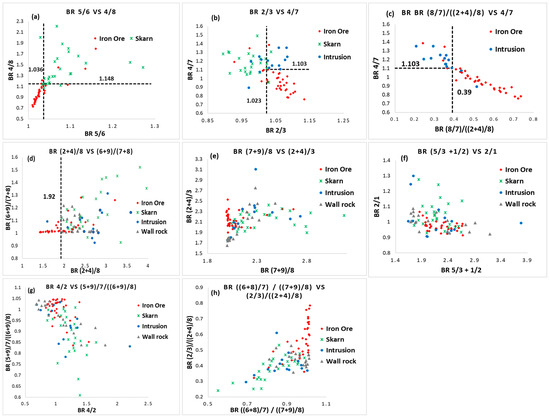 The analysis utilized scatter plots of two band ratios per plot (Figure 4) to evaluate their efficacy in differentiating between mineral components. The plot of BR 4/8 against 5/6 (Figure 4a) demonstrated the capability of these ratios to distinguish between ores and skarn minerals, with skarn minerals consistently displaying higher ratio values compared with ores. Additionally, iron ore samples exhibited uniform reflectance between bands 5 and 6, while skarn minerals displayed distinct absorption between these bands.
