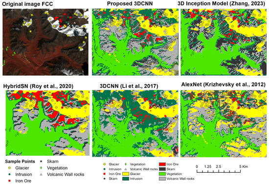 Relative to other models evaluated, the proposed model exhibited superiority, emphasizing that the depth of a network does not always correlate with superior performance, as deeper networks may capture extraneous patterns that may augment training accuracy but offer marginal benefits to testing performance [57]. The integration of residual layers within the proposed model architecture was identified as a key contributor to its superiority, enhancing generalization capacity, improving model stability, and mitigating overfitting, thereby preventing issues such as gradient disappearance and augmenting the learning rate [17,18,66]. Additionally, the utilization of larger patches in the other methods (HybridSN, AlexNet, and the 3D inception model) leads to overgeneralization in classification outcomes, resulting in smoother images that prevent subtle spatial variations typical of skarn iron formations, characterized by the sharp contact zonation between ores and surrounding rocks [38,67,68].
