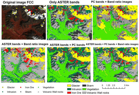During the evaluation of the impact of the integration of PCs, band ratio images, and original ASTER bands, the incorporation of BRs into the ASTER bands notably influenced the classification outcomes, reducing misclassified pixels in the context of glaciers and wall rocks and thereby enhancing the accuracy of the classified image, particularly in glaciers and wall rock categorization. However, the remarkable results obtained while using only ASTER bands as input relative to the use of either ASTER bands with band ratios or PC bands with band ratios was unexpected, considering the anticipated favorable contribution of band ratios to accuracy, given their documented potential to enhance the spectral signatures of targeted features in prior studies [3,13,51,52,53]. Additionally, the classified image resulting from the integration of PC bands with ASTER bands exhibited notable visual and statistical improvements in mitigating misclassifications observed in the classified image derived from ASTER bands in conjunction with band ratios (Figure 6). However, this integration led to a reduction in the accuracy of wall rock classification, with some wall rocks erroneously classified as skarn or intrusions. Consequently, the pursuit of a solution through the simultaneous incorporation of all three sets of bands was prompted.