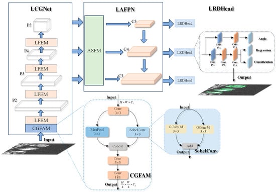 In this paper, we propose an arbitrary-direction ship detection method named LSR-Det. The overall structure is illustrated in Figure 1. The backbone network employed is LCGNet, which primarily consists of CGFAM and multiple LFEMs. The feature maps output from the last three segments of the backbone network are used as inputs to the neck network, denoted as {P3, P4, P5}. The proposed neck network is named LAFPN, which processes these inputs to produce output feature maps {C3, C4, C5}, using ASFMs between adjacent feature layers. It is important to note that features in different layers vary in size, with the three output feature maps being 1/8, 1/16, and 1/32 of the input image, respectively, used for predicting small, medium, and large ship targets. The head network proposed, called LRDHead, is divided into three branches: classification, regression, and angle prediction. It optimizes feature extraction by using the structural design of shared convolutional parameters to address the imbalance in sample numbers at different scales across layers, thereby enhancing the network’s multi-scale detection capability. Additionally, the loss function used in the proposed method comprises two components: the classification loss function and the rotating anchor regression loss function.
