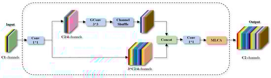 where and denote the top branch and the bottom branch in Figure 2, respectively. denotes a convolution operation of size 1 × 1, denotes a channel shuffle operation, denotes a group convolution operation of size 3 × 3, and denotes the embedded MLCA attention mechanism.