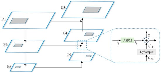 Ship targets in SAR images exhibit multi-scale features. To enhance detection capabilities for multi-scale targets, feature pyramid networks (FPNs) [30] are frequently employed for feature fusion. FPN achieves multi-scale feature integration by connecting high-level and low-level feature maps through top-down pathways and lateral connections, thereby enhancing target detection performance. However, the feature fusion method in FPN is constrained to element-wise addition or concatenation of features along the channel dimension, which fails to fully exploit the complex relationships and complementary information between high-level and low-level features. While other feature fusion networks, such as PAFPN and BiFPN, more fully utilize features in different dimensions, SAR images, compared to optical remote sensing images, have lower resolution and more noticeable scattering noise. The longer propagation paths of structures like PAFPN and BiFPN can lead to a loss of ship texture details, negatively affecting the detection ability of small target ships. Additionally, the more complex structure of these networks increases the computational cost of model training and inference, which does not meet our task requirements. Consequently, to improve multi-scale ship target detection while reducing network complexity, we have designed the lightweight adaptive feature pyramid network (LAFPN) based on FPN. The specific structure of LAFPN is depicted in Figure 3.