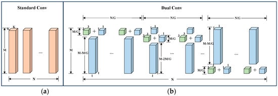 It is worth noting that we implemented the two 3 × 3 convolution blocks using the lightweight convolution DualConv [33], which merges the feature extraction capabilities of a 3 × 3 convolution with the processing efficiency of a 1 × 1 convolution kernel. This approach simultaneously processes the same input feature mapping channels (see Figure 6b), offering fewer parameters compared to standard convolution while enhancing feature utilization. Additionally, to address the issue of inconsistent BatchNorm behavior between the training and inference phases—often resulting in reduced detection accuracy during inference—we use GroupNorm instead of BatchNorm in the convolution module. This design effectively reduces the number of parameters while improving detection accuracy.
