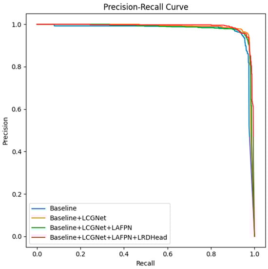 Based on the results shown in Table 3, several conclusions can be drawn. Compared to the baseline, the proposed method demonstrates an increase in the AP50 and F1 values by 1.6% and 1.5%, respectively. Additionally, the values of the parameters and FLOPs decrease by 68.0% and 61.5%, respectively, and the model size is only 2.6 M, which indicates the excellent performance of LSR-Det in all aspects.