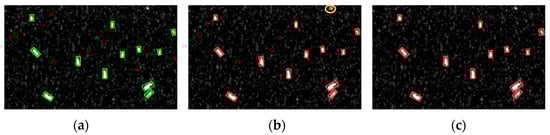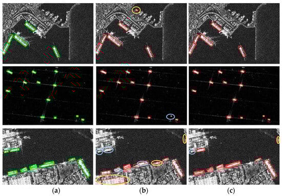 Visualization of the detection results. (a) Ground truth. (b) Baseline. (c) LSR-Det. Green: ground truths. Red: detection results. Blue: missed detections. Yellow: false alarms.