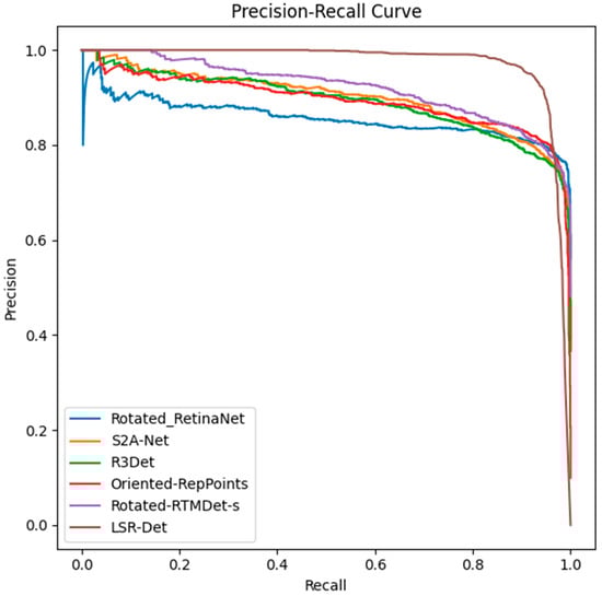 To assess the generalizability of the method, we continued our experiments with various currently popular arbitrary-oriented detection methods on the RSDD-SAR dataset. The specific detection results are shown in Table 5. It is evident from the table that the proposed method, LSR-Det, achieves the highest values for AP50 and F1, which are 97.2% and 93.3%, respectively. Notably, in terms of the AP50 values, LSR-Det surpasses Oriented-RepPoints, S2A-Net, and Rotated-RTMDet-s by 7.7%, 7.2%, and 7.0%, respectively, demonstrating its values of 0.98 M and 3.21 G for the parameters and FLOPs, respectively, compared to the other methods. This indicates that the proposed method considers both detection accuracy and model size, proving the superiority of LSR-Det. As shown in Figure 10, the precision–recall curves corresponding to these methods more intuitively reflects the accuracy advantage of LSR-Det over the other methods.