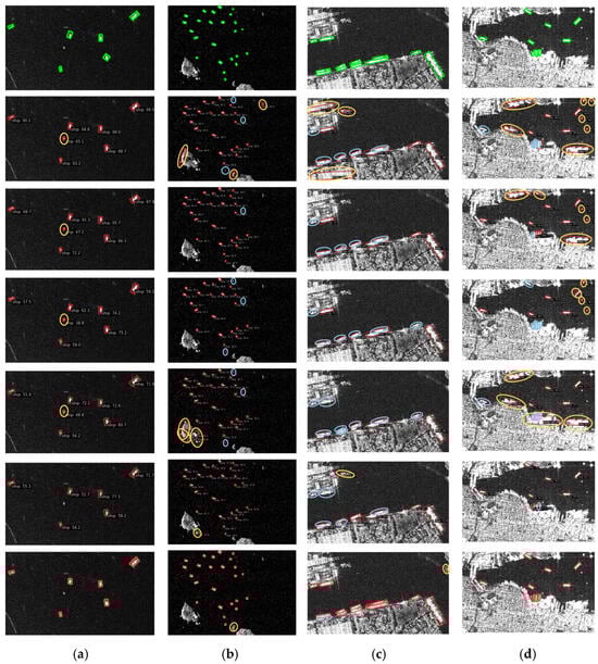 Visualization of the detection results of various methods on RSDD-SAR. (a) Offshore Scene 1. (b) Inshore Scene 1. (c) Inshore Scene 2. (d) Inshore Scene 3. From top to bottom: ground truths, Rotated-RetinaNet, S2A-Net, R3Det, Oriented-RepPoints, Rotated-RTMDet-s, and LSR-Det. The green boxes indicate the ground truths, the red boxes indicate detection results, the blue circles indicate missed detections, and the yellow circles indicate false alarms.