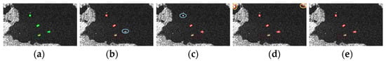 Visualization of the detection results for different backbone networks. (a) Ground truths. (b) EfficientNet. (c) MoblieNetv3. (d) GhostNetv2. (e) LCGNet. Green: ground truths. Red: detection results. Blue: missed detections. Yellow: false alarms.