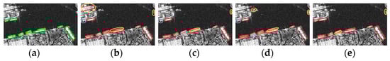 We also visually represent these methods. Figure 15 depicts some sparse ship target distributions in the inshore scenario of the SSDD+ dataset. The detection results with EfficientNet, MobileNetv3, and GhostNetv2 as the backbone network all exhibit missed detections or false alarms. In contrast, the detection network with the LCGNet as the backbone network correctly detects all the ship targets, further proving the effectiveness of the LCGNet.