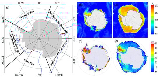 The study area in this paper encompasses the ocean surrounding Antarctica, specifically at latitudes above 60°S. Due to the regional influences, sea ice and its surface snow exhibit significantly different characteristics around Antarctica [,]. To better analyze the spatial distribution and the underlying processes, the Antarctic Ocean is commonly divided into five sectors: Weddell Sea (60°W–20°E), Bellingshausen and Amundsen seas (130°–60°W), Ross Sea (160°E–130°W), Southern Indian Ocean (90°–160°E), and the Southern Pacific Ocean (20°–90°E) (Figure 1a). In general, Antarctic sea ice has rapidly decreased in recent years. After breaking low Antarctic sea ice extent records in 2016 and 2022, the extent reached its lowest historical level in the past 40 years in 2023 [,]. In the Antarctic Ocean, sea ice levels fluctuate seasonally; only the coastal regions of the Antarctic continent retain ice during the melting season, whereas the ice cover extends further from the shore during the ice growth season [].