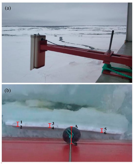 (a) A measured camera fixed on the R/V XueLong used to record sea ice and snow situation during the 35th Chinese National Antarctic Research Expedition and (b) snow depth estimation involving photogrammetric images. The long red line in (b) denotes the reference ball diameter and the short red lines denote snow depth on sea ice.