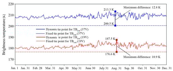 Comparison of fixed (traditional method) and dynamic (this study) tie points calculated from the HY-2B SMR measured brightness temperature at 19 and 37 GHz for open sea water in 2019.