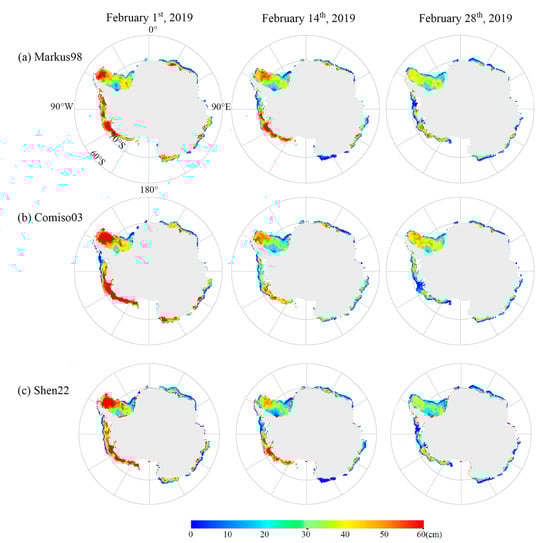 Based on commonly used remote sensing models for the retrieval of snow depth on sea ice, namely Markus98 [], Comiso03 [], and Shen22 [], this study employed HY-2B SMR data to retrieve the snow depth for Antarctic sea ice. Figure 4 presents the snow depth retrievals based on the three different models, with each model’s results indicated by a separate trace (taking 1 February, 14 February, and 28 February in 2009 as examples). Generally, the retrieved snow depth retrieved from HY-2B based on Markus98, Comiso03, and Shen22 models has similar spatial distribution, with thicker snow concentrated in the Weddell Sea and Bellingshausen and Amundsen seas, which are mainly in multi-year ice areas []. Due to the melting sea ice season in February, only thin snow existed on the remaining sea ice in the Southern Indian and Southern Pacific oceans. Among the differences in snow depth derived from the three models, the snow depth retrieved from HY-2B SMR data based on the Comiso03 model was relatively thicker than that retrieved using the Shen22 and Markus98 models.