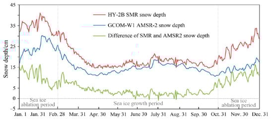 Additionally, it is important to consider the effects of day-time melt and nightly freeze of the snow on sea ice. Consequently, a highly scattering layer is created, leading to an overestimation of the snow depth on sea ice []. Snow-covered ice can be re-covered by new snow. Additionally, the melt–refreeze phenomenon alters snow properties, including changes in snow grain size and density. These factors contribute to an overestimation of the snow depth on sea ice during the remote sensing retrieval from passive microwave data []. To mitigate the impact of these uncertainties on snow depth retrieval from HY-2B SMR data, this study employs a sliding 5-day box window for the retrieved snow depth [,].