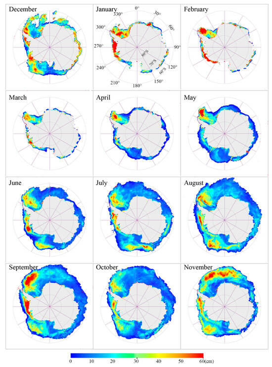 Figure 6 displays the spatial distribution of monthly snow depth derived from HY-2B SMR in 2019. During the Antarctic summer season (December to February), thinner sea ice and its surface snow gradually melt as temperatures increase, leading to the minimum extent of sea ice coverage []. A small amount of thicker snow was distributed on the remnants of multi-year ice in the Weddell Sea and Bellingshausen Sea, as well as in nearshore regions of other Antarctic sea areas. In January, the average snow depth reaches its maximum at 36.2 cm. As temperatures decrease, the sea ice growth period begins in March, and, along with the growth of new ice [], the spatial average snow depth on sea ice gradually decreases, reaching its lowest average value of 15.3 cm in May. During the Antarctic winter, snow continues to accumulate on the newly formed ice, with thicker snow accumulation observed in the northwest regions of the Weddell Sea and the Bellingshausen and Amundsen seas []. In early spring, the sea ice continues to grow until October, reaching its peak extent, and the snow accumulation rate slows down, leading to a decrease in snow depth on Antarctic sea ice. However, as temperatures rise again, both the snow and sea ice decay and melt, causing an increase in the remaining snow depth on the thicker Antarctic sea ice surviving in November and beyond.