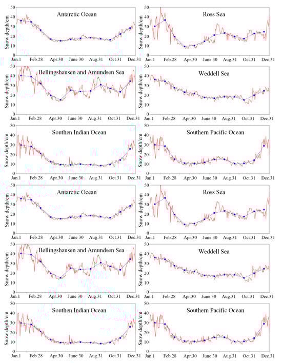 Time-series of snow depth on Antarctic sea ice and its various sea areas derived from HY-2B SMR data in 2019. The red solid line is the daily HY-2B SMR snow depth and the blue dashed line is the monthly average HY-2B SMR snow depth.