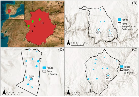 Geographical location of the pilot farms and their watering ponds in Extremadura (A). (B) Parapuños de Doña María (PAR4 and PAR6), (C) La Brava (BRA8), (D) La Barrosa (BAR6).