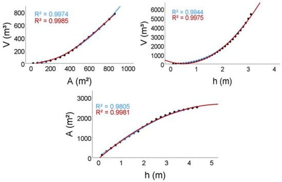 Figure 3 shows illustrative scatterplots that show the relationships between V-A-h parameters for some ponds. Blue and red lines represent power and quadratic functions. Black dots represent observed vs. measured values of V-A-h. The R2 values, always above 0.9, demonstrate strong statistical relationships, with quadratic functions showing the highest R2 values. The V-h relationship in Par6 for the quadratic function returned an R2 = 1, being the most accurate. On the contrary, the A-h relationship for the power function of the Bar6 pond showed an R2 = 0.90, being the least accurate. It can be seen from the graphs that the quadratic functions are more accurate than the power functions since the latter do not fit at specific parts of the curve. For instance, the V-A relationship for Par4 shows that the blue line does not fit well in the x-coordinate in 2000 m3 and above. A similar behavior can be observed in Bar6, where the blue line does not fit in the x-coordinate at 1000 m3 and above. The V-A relationship in Par6 showed a good fit for both functions.