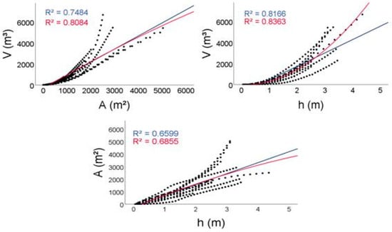 Figure 4 shows the relationships for the whole dataset (n = 11), i.e., including our four cases besides the Marín-Comitre et al. [] dataset. These plots show the fit of the power (blue line) and quadratic (red line) functions as well as their corresponding R2. In general, the quadratic functions showed the highest R2. In the case of the V-A relationship, the power function showed an R2 = 0.748 in comparison to the quadratic function with an R2 = 0.808. The A-h relationship showed the worst performance while the V-A and V-h, which are the most useful equations for farmers, showed an R2 above 0.75.