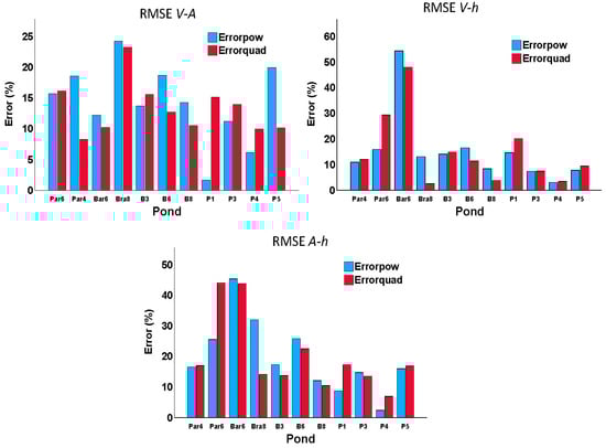 Figure 5 shows the RMSE for the different models at each pond and using the generalized equations. For the V-A, the RMSE was below 25%. The quadratic and power functions showed errors of the same magnitude for each pond. The figure highlighted the large RMSE observed at Bar6 (close to 50%) for the V-h and A-h relationship. On the contrary, P4 showed the lowest RMSE in the V-h and A-h relationships.
